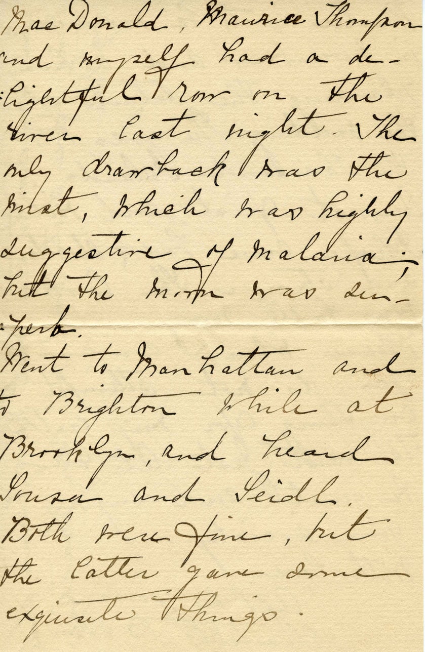 Phas Donald, Maurice Thompson and myself had a delightful row on the river last night. The only drawback was the pilot, which was highly suggestive of malaria; but the moon was superb. Went to Manhattan and to Brighton while at Brooklyn, and heard Sousa and Leidl. Both were fine, but the latter gave some exquisite things.