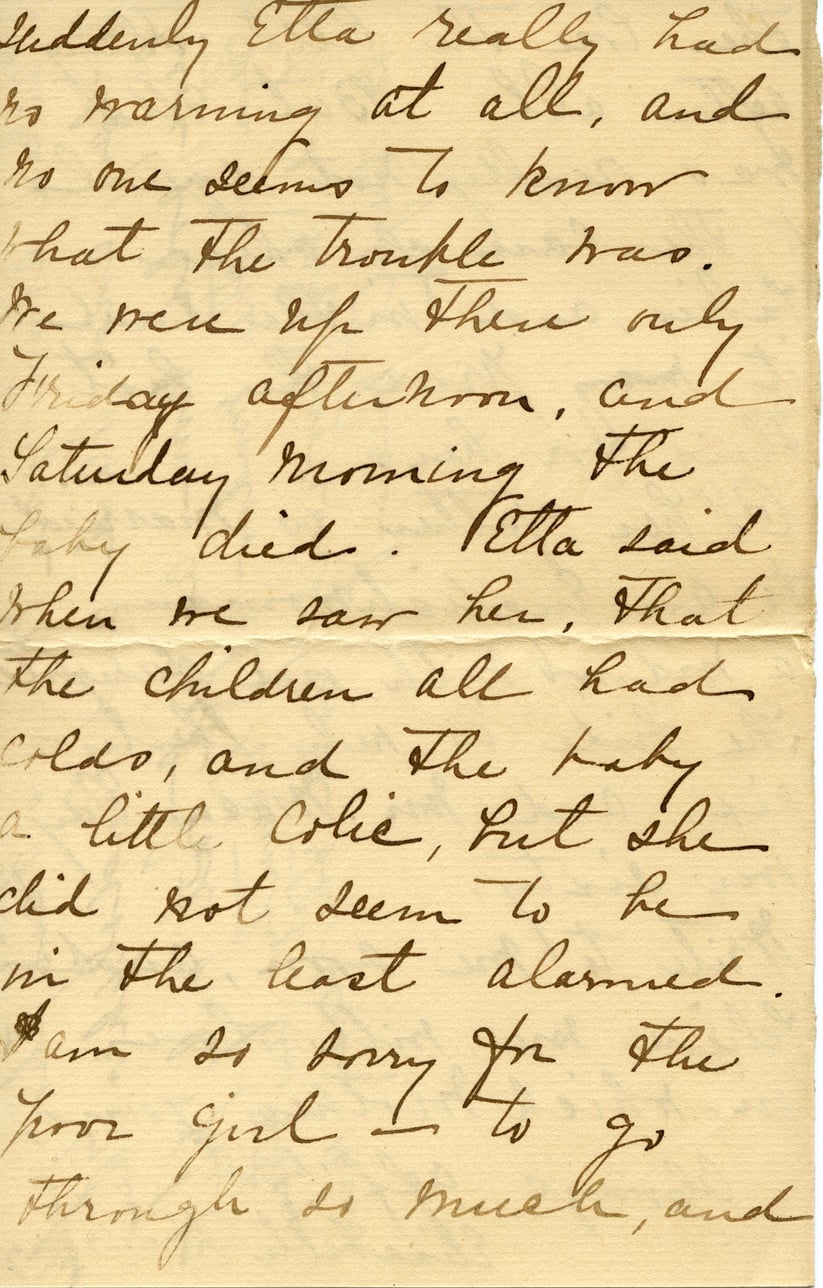Suddenly Ella really had no warning at all, and no one seems to know what the trouble was. We were up there only Friday afternoon, and Saturday morning the baby died. Ella said when we saw her, that the children all had colds, and the baby a little colic, but she did not seem to be in the least alarmed. I am so sorry for the poor girl—to go through so much, and