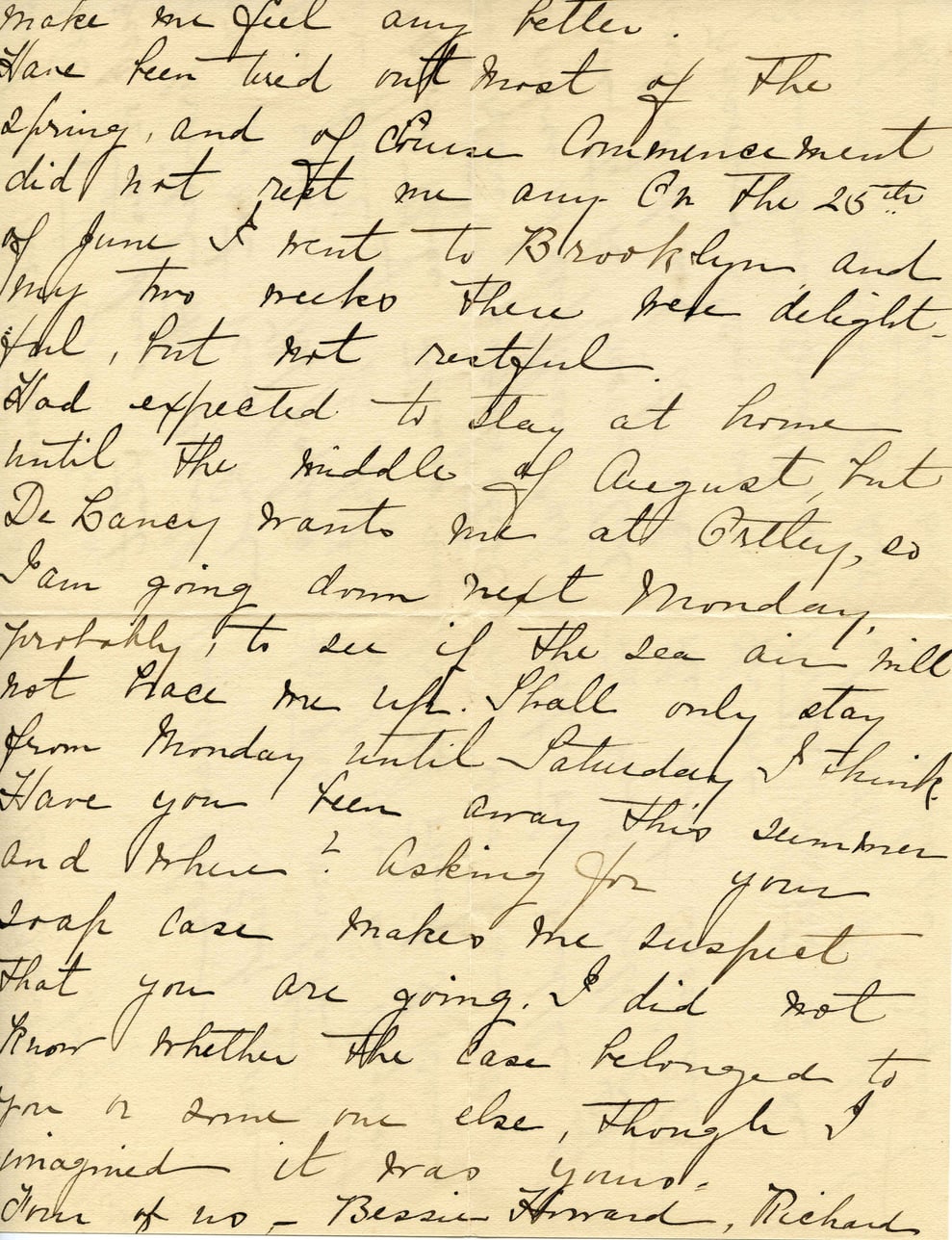 make me feel any better. Have been tired out most of the spring, and of course commencement did not rest me any. On the 26th of June I went to Brooklyn and only two weeks there were delightful, but not restful. Had expected to stay at home until the middle of August, but De Lancey wants me at Otley, so I am going down next Monday probably, to see if the sea air will not have me up. Shall only stay from Monday until Saturday I think. Have you been away this summer and where? Asking for your graph case makes me suspect that you are going. I did not know whether the case belonged to you or someone else, though I imagined it was yours. Yours of us—Bessie Howard, Richard