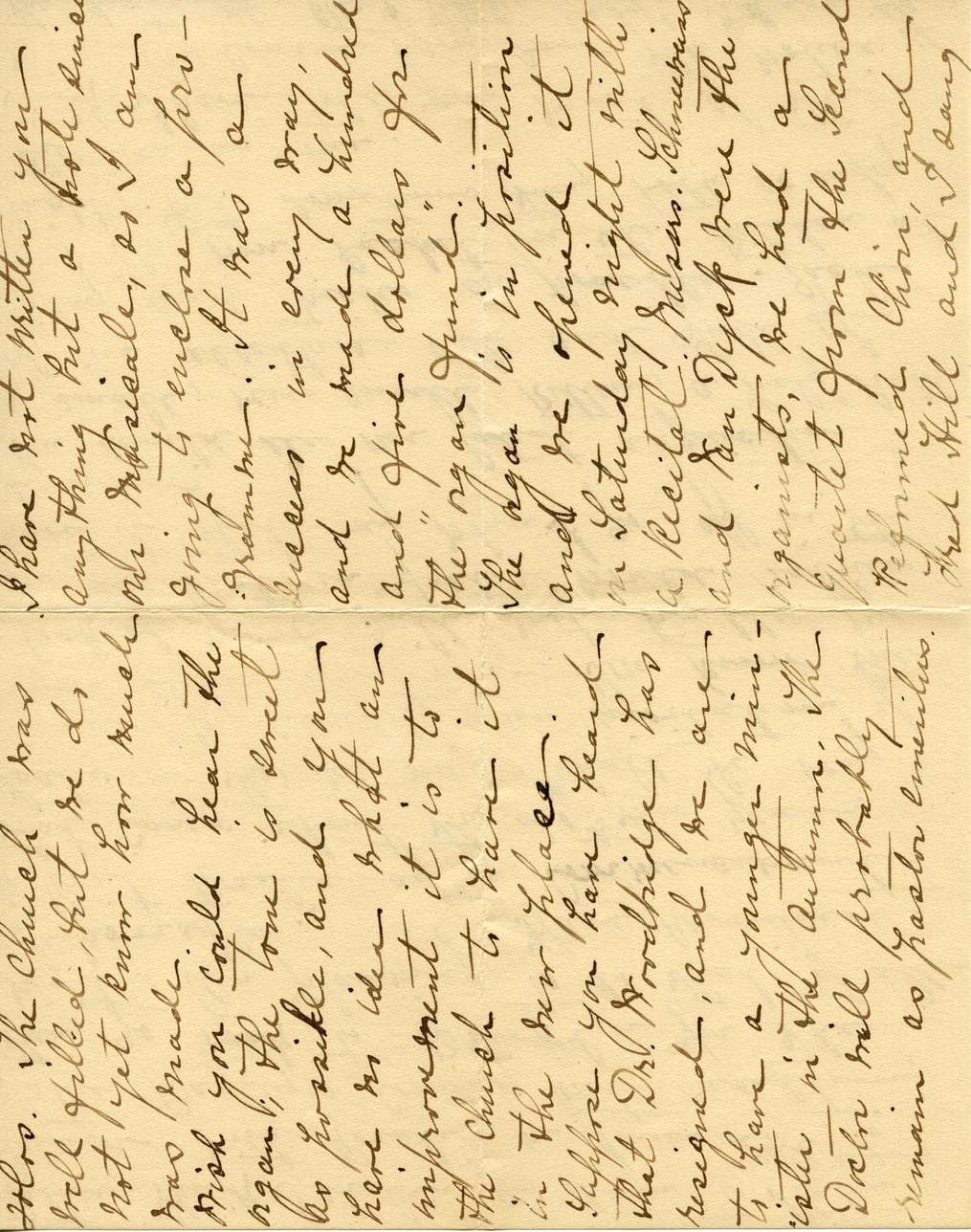 The Church has not written you. I have not written you. The Church has been filled, but we do anything but a note since. Have not yet known how much oil wholesale, as if any has made. Going to enclose a few—wish you could hear the organ again! The tone is sweet enough for every pray'go Frankie, and you and he made a hundred have no idea what an amel five dollars for. Widow Grant it is to the church to have it in the new place. Suppose you have heard that Dr. Prokidge has resigned, and he are to have a younger minister in the autumn. The Delos will probably remain as pastor emeritus. I have sent written you Grammer. It was a blessing we every pray'go Frankie, and you and he made a hundred have no idea what an amel five dollars for. Widow Grant it is to the church to have it in the new place. Suppose you have heard that Dr. Prokidge has resigned, and he are to have a younger minister in the autumn. The Delos will probably remain as pastor emeritus. Performer Choir, and I sang.