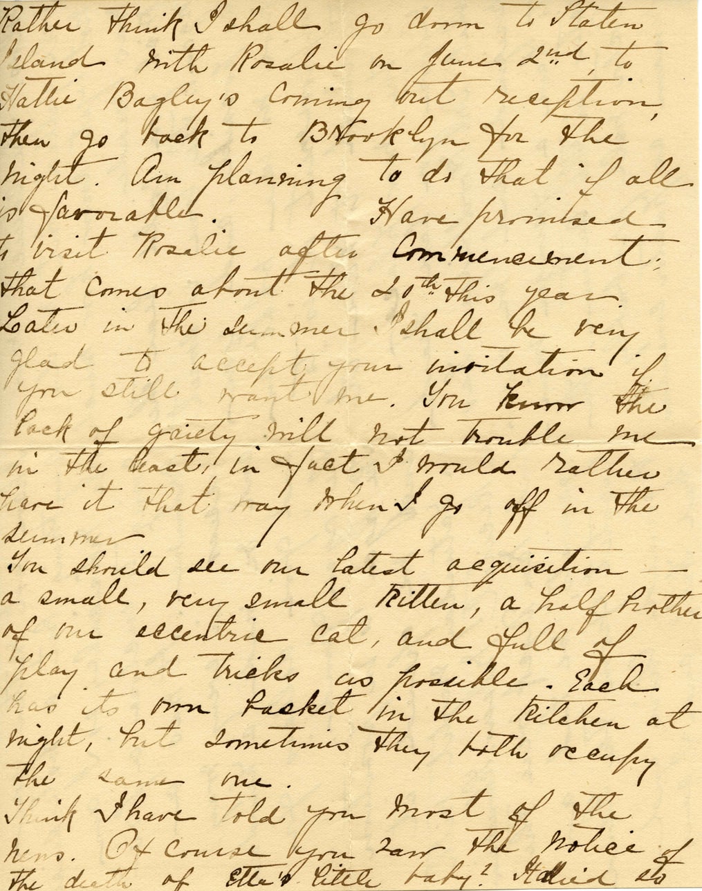 Rather think I shall go down to Staten Island with Rosalie on June 2nd to Nellie Bagley's coming but reception, then go back to Brooklyn for the night. Am planning to do that if all is favorable. Have promised to visit Rosalie after Commencement that comes about the 20th this year. Later in the summer I shall be very glad to accept your invitation if you still want me. You know the lack of gaiety will not trouble me in the least; in fact I would rather have it that way when I go off in the summer. You should see our latest acquisition—a small, very small kitten, a half brother of our eccentric cat, and full of play and tricks as possible. Each has its own basket in the kitchen at night, but sometimes they both occupy the same one. Think I have told you most of the news. Of course you saw the notice of the death of Ella's little baby? It did so