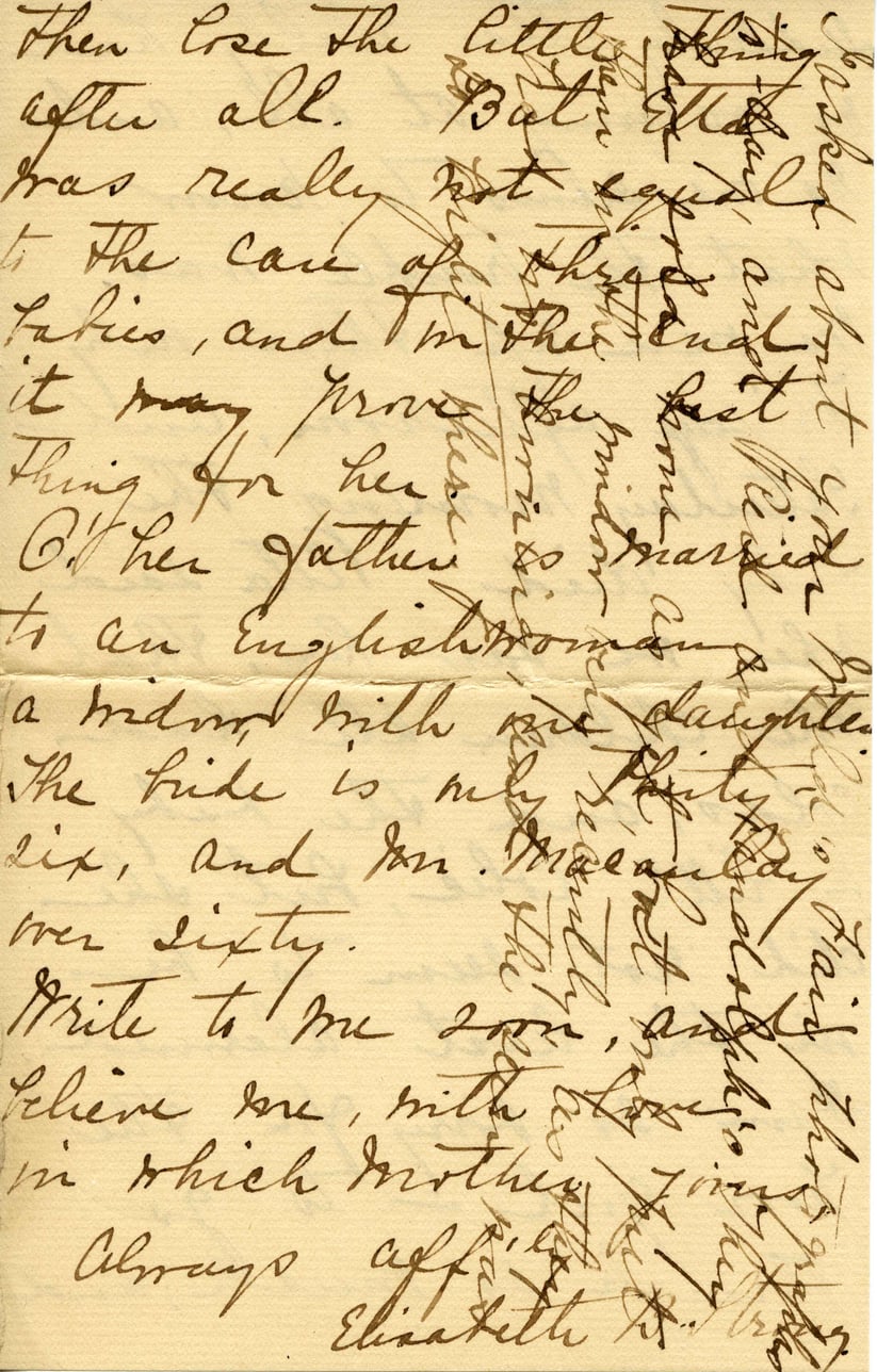 Then lose the little thing after all. Bat. was really not equal to the care of babies, and in it may prove best thing for her. Other father to an Englishwoman & a widow with six daughters. The bride is only six, and Jan. over sixty. Write to me soon, and believe me, with love in which Mother always aff. Elizabeth
