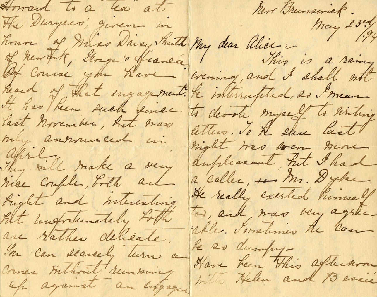 @alice_austen_house:organization {type: "Museum", location: @staten_island}Howard to a "tea" at The Duryeas', given in honor of Miss Daisy Smith of Newark, George's fiancée. Of course you have heard of that engagement. It has been such since last November, but was only announced in April. They will make a very nice couple, both are bright and interesting but unfortunately both are rather delicate. You can scarcely turn a corner without running up against an engaged New Brunswick May 23rd, '94 My dear Alice: This is a rainy evening, and I shall not be interrupted, so I mean to devote myself to writing letters. To the sun last night was even more unpleasant, but I had a caller, Mr. Dyke. He really exerted himself too, and was very agreeable. Sometimes he can be so dumpy. Have been this afternoon with Helen and Bessie.