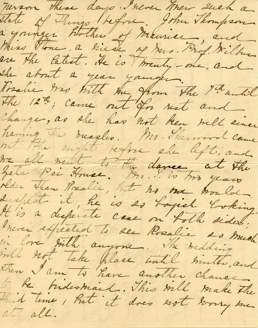 person these days. I never knew such a state of things before. John Thompson, a younger brother of Maurice, and Miss Stone, a niece of Mrs. Prof. Wilkin are the latest. He is twenty-one, and she about a year younger. Rosalie was with me from the 7th until the 12th; came out for rest and change, as she has not been well since having the measles. Mr. Sherwood came out the night before she left, and we all went to the dances at the Zela Pai House. Mr... is two years older than Rosalie, but no one would suspect it, he is so languish looking. It is a desperate case on both sides; I never expected to see Rosalie so much in love with anyone. The wedding will not take place until winter, and then I am to have another chance to be bridesmaid. This will make the third time, but it does not worry me at all.