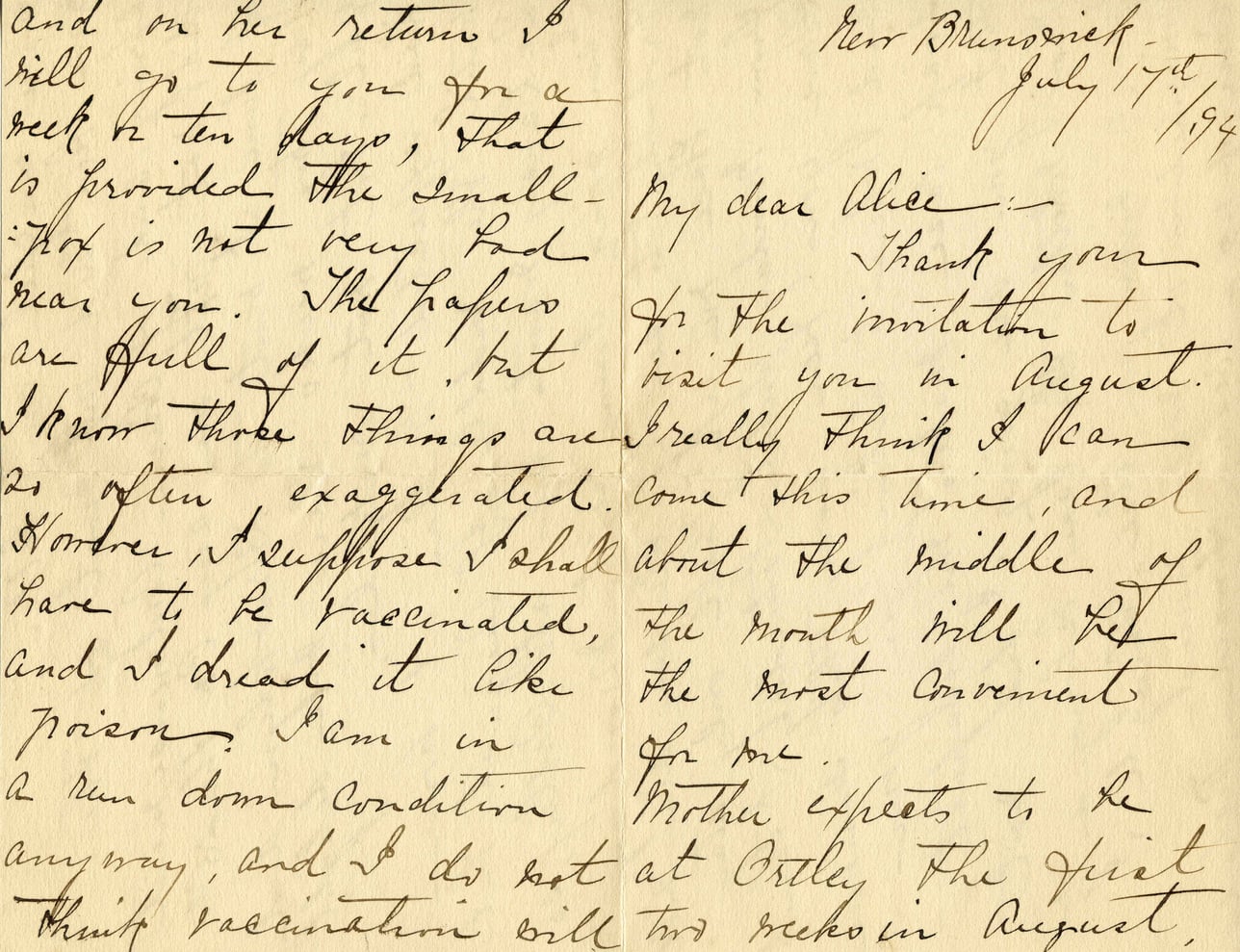 New Brunswick July 17th, 1894 My dear Alice— Thank you for the invitation to visit you in August. I really think I can come this time, and about the middle of the month will be the best convenience for me. Mother expects to be at Orley the first two weeks in August. and on her return I will go to you for a week or ten days. That is provided the smallpox is not very bad near you. The papers are full of it, but I know these things are so often exaggerated. However, I suppose I shall have to be vaccinated, and I dread it like poison. I am in a run down condition anyway, and I do not think vaccination will