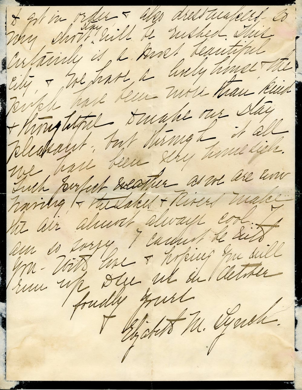& get in order & also dress myself! So why should I will be rushed. This certainly is a fine beautiful city & we have a lovely time. The people have been more than kind & thoughtful to make our stay pleasant, but though it all we have been very homesick. Such perfect weather as we are now having, & trees, lakes & rivers make the air almost always cool. I am so sorry I could not be with you. With love & hoping you will run up over us in October fondly yours Elizabeth M. Lynch