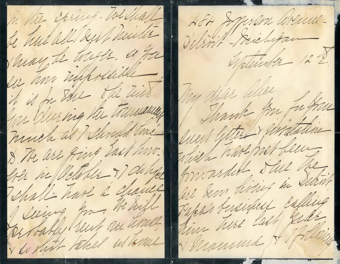 in the spring. We shall be here all next winter & may be longer, so you see how impossible it is for me to see you during the tournament, much as I should like. We are going East here over in October & I do hope I shall have a chance seeing you. We will probably rent an house & so that takes us home. 484 Jefferson Avenue Detroit - Michigan September 12th My dear Alice, Thank you for your sweet letter & invitation which have just been forwarded & tell me we are now living in Detroit. Papa's beneficent calling him here last year & Maumee & Peking