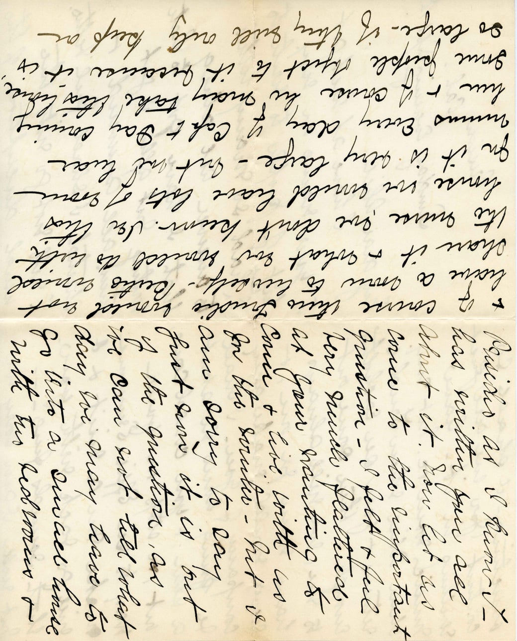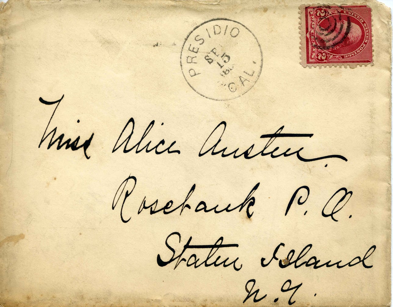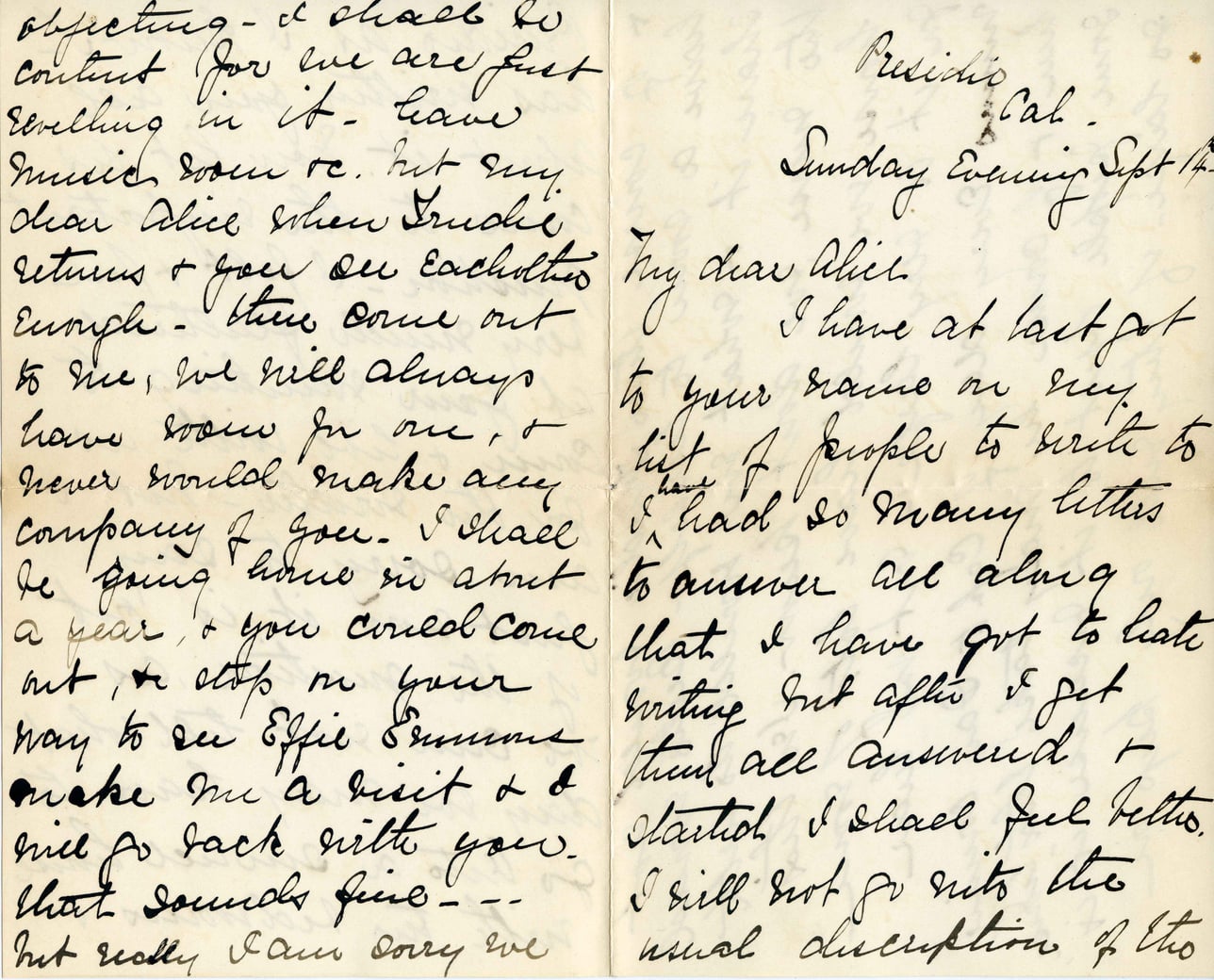 objecting—I shall be content for we are just reveling in it—have music, room &c. But my dear Alice when Trude returns & you are each other's enough—there come out to me, we will always have room for one, & never would make any company if you. I shall be going home in about a year, & you could come out, & stop on your way to see Effie Emmuns make me a visit & I will go back with you. That sounds fine—But really I am sorry we Presidio Cal. Sunday Evening Sept 14 My dear Alice, I have at last got to your name on my list of people to write to & had so many letters to answer all along that I have got to hate writing but after I get them all answered & started I shall feel better. I will not go into the usual description of the