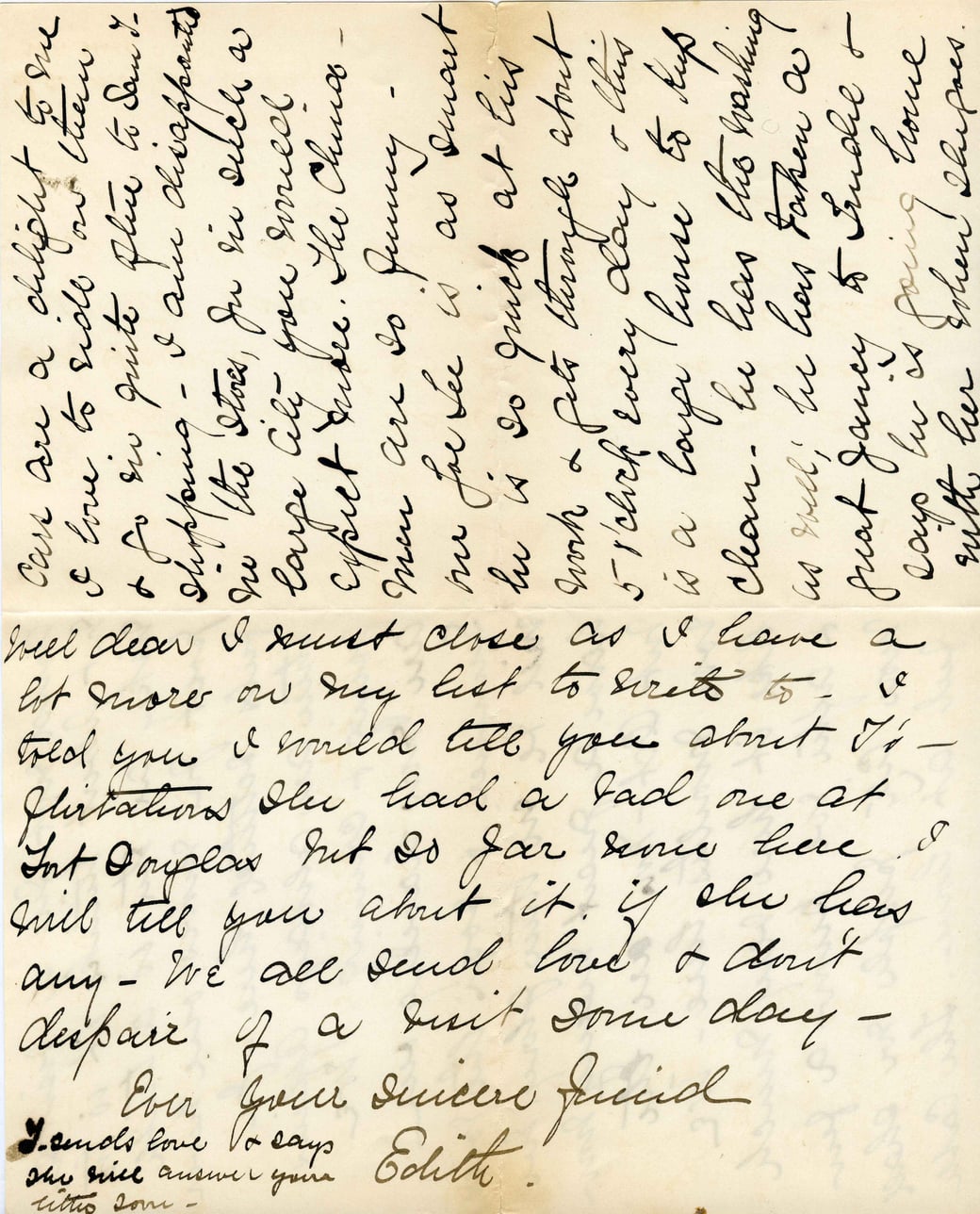 can be a delight to me & love to ride on them & go in quiet place to see it shopping - is our chief hearts. & in the store, you see such a large air space around expect Hubie. The chairs - Mine are so funny - Mr Joe Lee is as smart he is so quick at his work & sits straight about 5-1 each every day & his clean. He has the washing as well; he has taken a great fancy to Hubie & says he is going home with her soon! Well dear I must close as I have lot more on my list to write to. told you I would tell you about it - glutathors she had a bad one at Fort Douglas but so far since here I will tell you about it. if she has any - we all send love & don't despair of a visit some day - Ever your sincere friend Y sends love to says she will answer yours Edith.