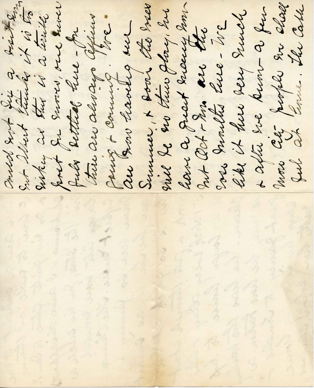 Greed sent us a visit from Est Albert thinks it is to visit us & stay to a week first in Quincy, our river July settled here—In these are always affairs young & coming. We are now having our Summer, & soon the boys will be in their Glory. But have a great snowy sum but Oct & Nov are the snow months here—We like it here very much & after we know a few more city people we shall feel at home. The Cabn
