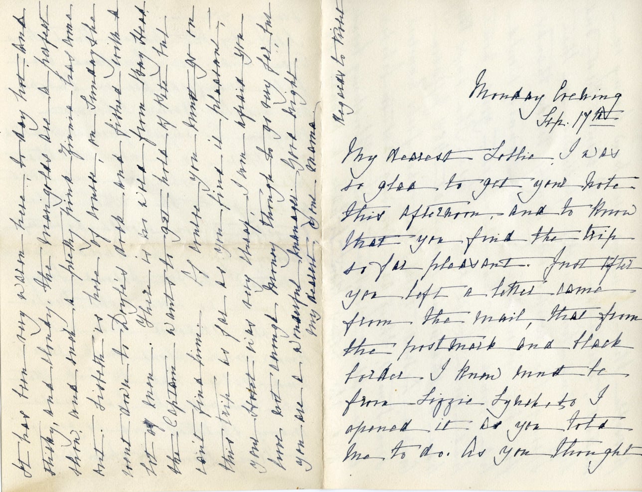 @file_1894_9_17_alice_cornell_austen_sept_17002_copy_jpg:file {type: "image", ocr: "Monday evening Sept. 19th\n\nMy dearest Lottie, I was so glad to get your note this afternoon, and to know that you find the trip so far pleasant. ...\n\n... Lizzie Lyttle ..."}