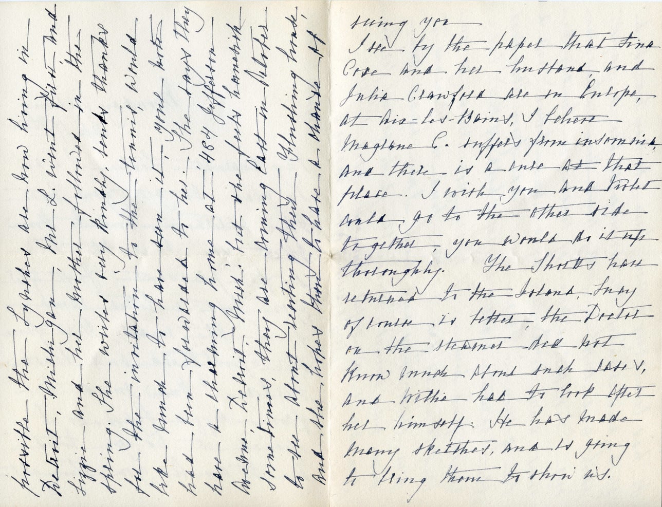 @file_1894_9_17_alice_cornell_austen_sept_17003_copy_jpg:file {type: "image", ocr: "The first, Michigan, Mrs. L. went first and Lizzie and her brother followed in the spring. ... Fine Crece and her husband and Julia Crawfurd are in Europe, at Rio de Janeiro ... Magdane C. suffers from insomnia ... Lucy ... Ruth ..."}
