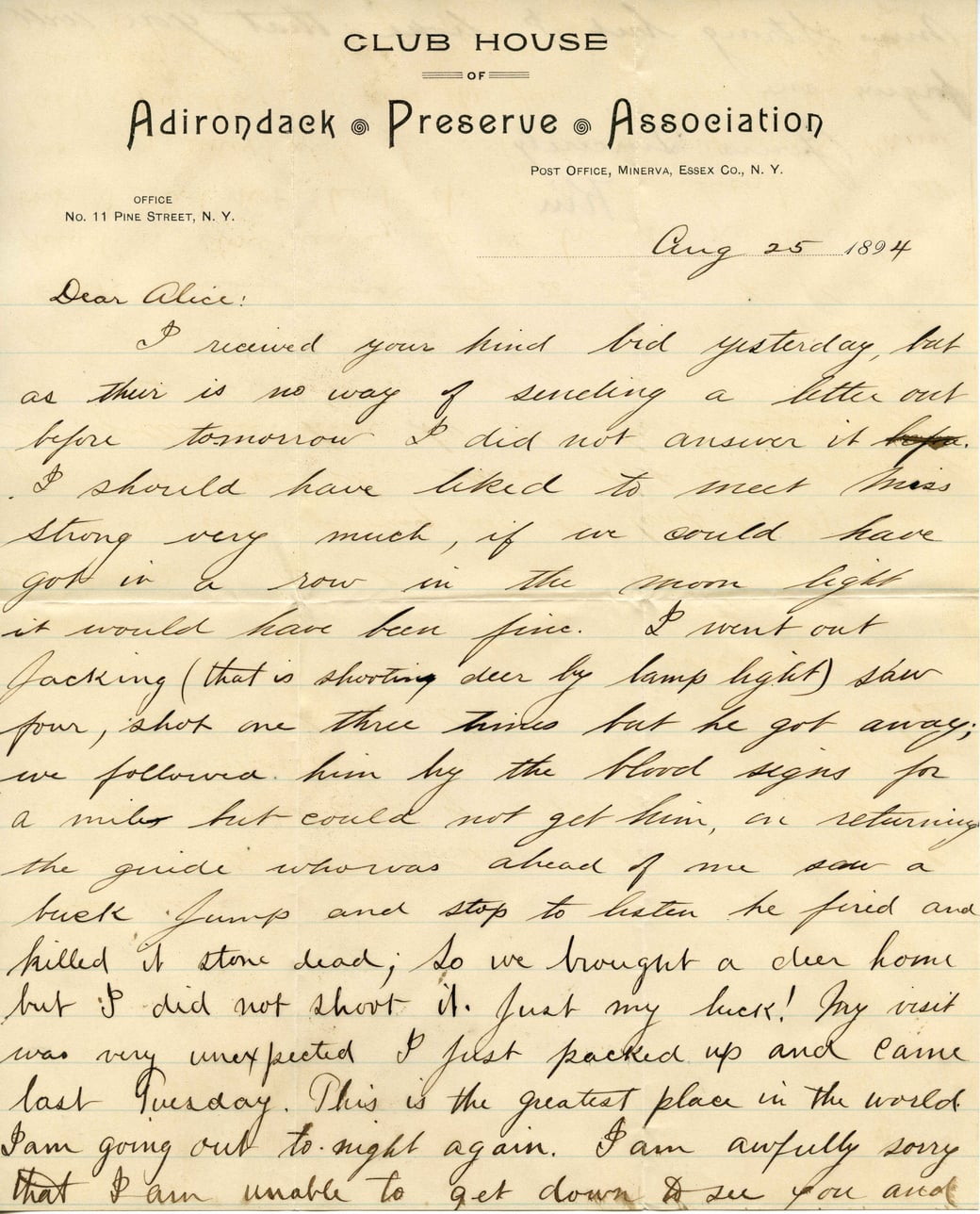 @adri_trip_letter_collection -> includes -> @file_1894_8_26_aug_4003_kim_copy_jpgCLUB HOUSE OF Adirondack Preserve Association POST OFFICE, MINERVA, ESSEX CO., N.Y. OFFICE No. 11 PINE STREET, N.Y. Aug 25 1894 Dear Alice: I received your kind bid yesterday, but as there is no way of sending a letter out before tomorrow I did not answer it before. I should have liked to meet Miss Strong very much, if we could have got in a row in the moon light it would have been fine. I went out packing (that is shooting deer by lamp light) saw four, shot one three times but he got away; we followed him by the blood signs for a mile but could not get him, on returning the guide who was ahead of me saw a buck jump and stop to listen he fired and killed it stone dead; So we brought a deer home but I did not shoot it. Just my luck! My visit was very unexpected I just packed up and came last Tuesday. This is the greatest place in the world. I am going out tonight again. I am awfully sorry that I am unable to get down to see you and