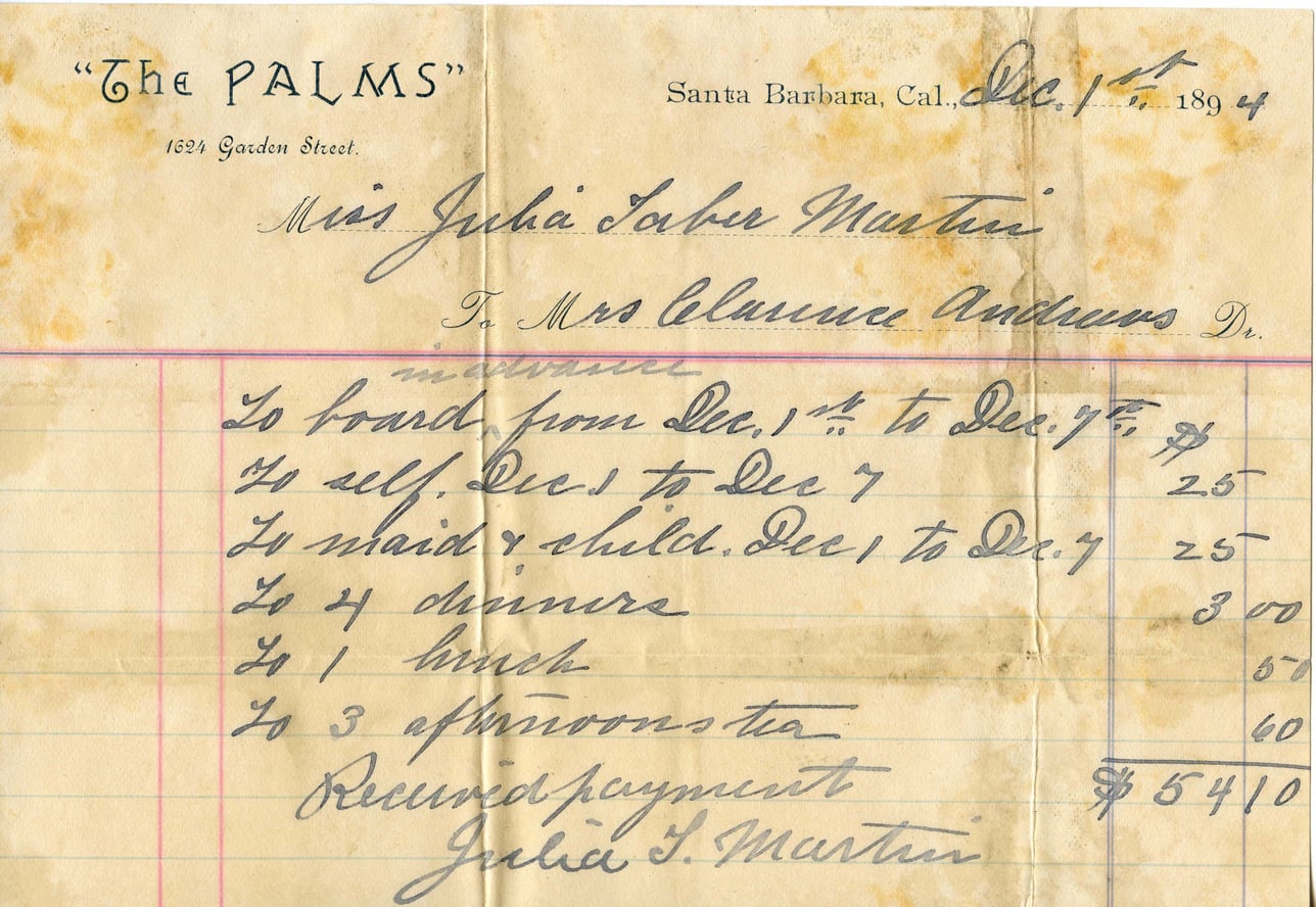 "The Palms" 1624 Garden Street. Santa Barbara, Cal., Dec. 1st, 1894 Miss Julia Saber Martin To Mrs. Elamune Andrews Dr. in advance To board from Dec. 1st to Dec. 7th $7 To self, Dec. 1 to Dec. 7 25 To maid & child, Dec. 1 to Dec. 7 25 To 4 dinners 3.00 To 1 lunch 5.0 To 3 afternoon tea 60 Received payment $54.10 Julia J. Martin