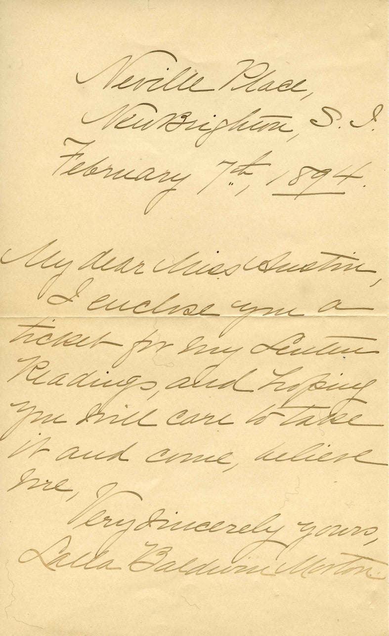 Neville Place, New Brighton, S. I. February 7th, 1894. My dear Miss Austin, I enclose you a ticket for my Lecture Readings, and hoping you will care to take it and come, believe me, Very sincerely yours, Lalla Baldwins Morton