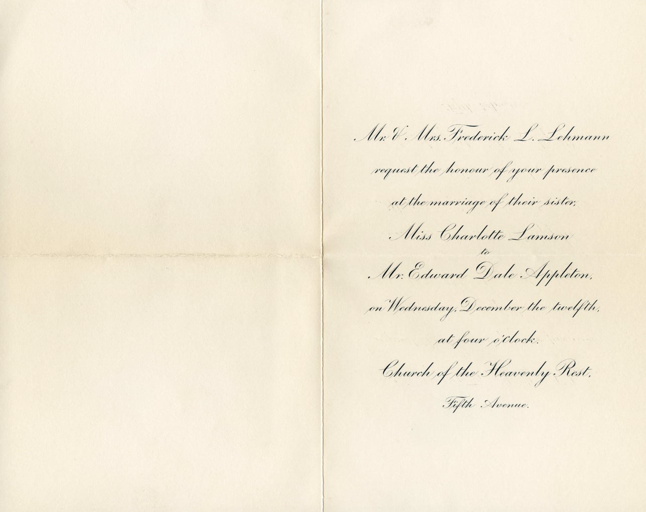 @file_1894_2_7_feb_2_1_lalla_morton_copy_jpg -> contains -> @lecture_ticket_mortonMr. & Mrs. Frederick L. Lehmann request the honour of your presence at the marriage of their sister, Miss Charlotte Lamson to Mr. Edward Dale Appleton, on Wednesday, December the twelfth, at four o'clock. Church of the Heavenly Rest, Fifth Avenue.