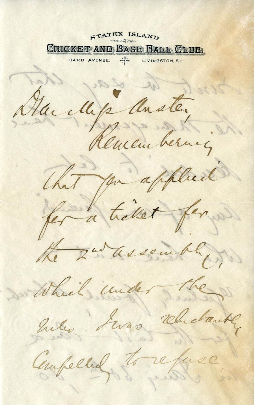 STATEN ISLAND CRICKET AND BASE BALL CLUB. BARD AVENUE. LIVINGSTON, S.I. Dear Miss Austen, Remembering that you applied for a ticket for the 2nd Assembly, which under the rules I was reluctantly compelled to refuse.