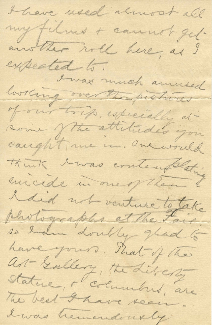 I have used almost all my films & cannot get another roll here, as I expected to. I was much amused looking over the pictures of our trip, especially at some of the attitudes you caught me in. One would think I was contemplating suicide in one of them. I did not venture to take photographs at the Fair so I am doubly glad to have yours. That of the Art Gallery, the Liberty Statue, & Columbus, are the best I have seen. I was tremendously