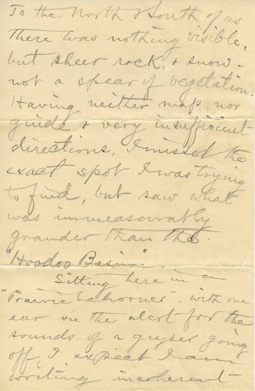 To the North & South of us there was nothing visible, but sheer rock, & snow—not a spear of vegetation. Having neither map nor guide & very insufficient directions, I missed the exact spot I was trying to find, but saw what was immeasurably grander than the "Hoodoo Basin." Sitting here in a "Prairie Teahouse," with one ear on the alert for the sounds of a geyser going off, I expect I am writing incoherent—