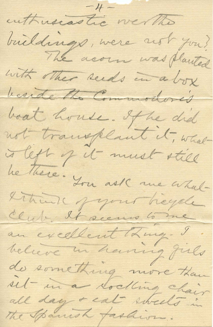 enthusiastic over the buildings, were not you? The acorn was planted with other seeds in a box beside the Commodore's boat house. If he did not transplant it, what is left of it must still be there. You ask me what I think of your bicycle club. It seems to me an excellent thing. I believe in having girls do something more than sit in a rocking chair all day and eat sweets in the Spanish fashion.