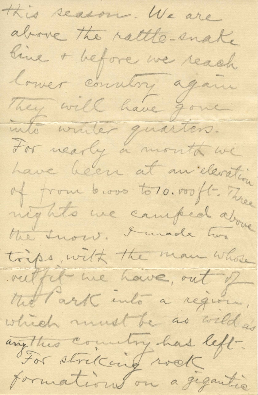 this season. We are above the rattle-snake line & before we reach lower country again they will have gone into winter quarters. For nearly a month we have been at an elevation of from 6,000 to 10,000 ft. Three nights we camped above the snow. I made two trips, with the man whose outfit we have, out of the Park into a region which must be as wild as any this country has left. For striking rock formations on a gigantic