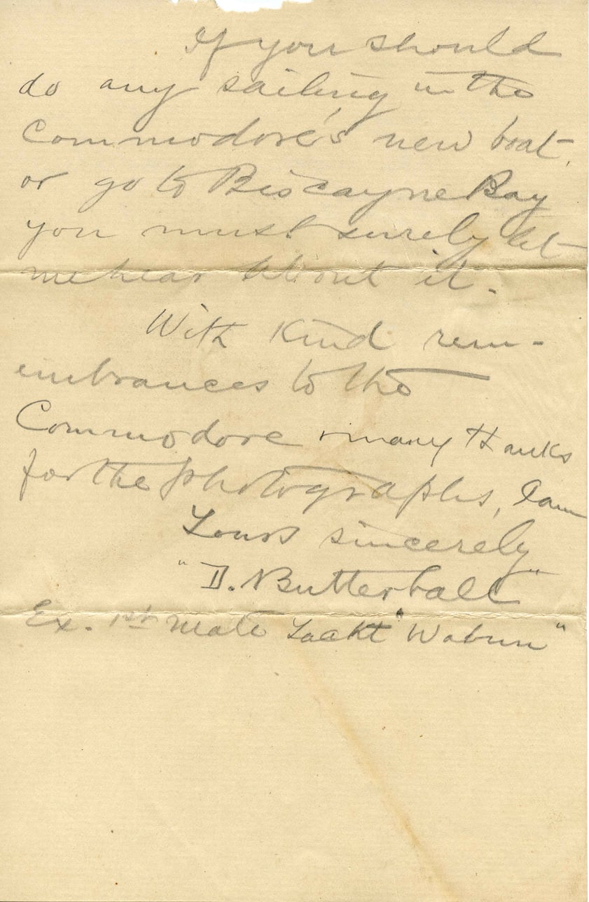 If you should do any sailing in the Commodore's new boat or go to Biscayne Bay you must surely let me hear about it. With kind remembrances to the Commodore & many thanks for the photographs, I am Yours sincerely, "J. Butterball" Ex. 1st mate Zacht "Watson"
