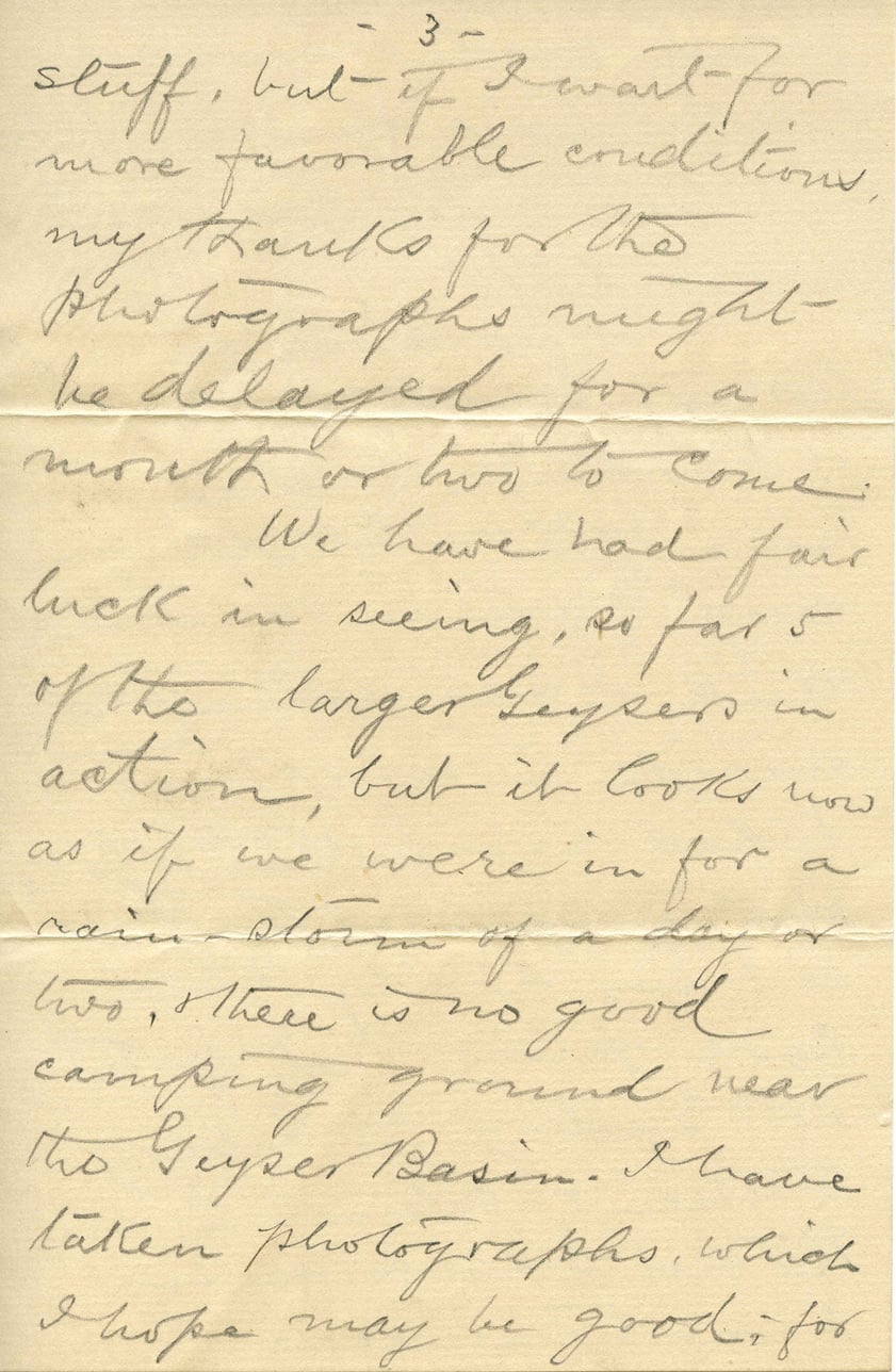 stuff, but if I wait for more favorable conditions, my thanks for the photographs might be delayed for a month or two to come. We have had fair luck in seeing, so far 5 of the larger geysers in action, but it looks now as if we were in for a rain-storm of a day or two, & there is no good camping ground near the Geyser Basin. I have taken photographs, which I hope may be good; for
