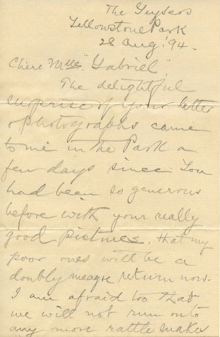 @letter -> mentions -> @zacht_watsonThe Geysers Yellowstone Park 28 Aug '94 Chère Mlle. "Gabriel" The delightful surprise of your letter & photographs came to me in the Park a few days since. You had been so generous before with your really good pictures, that my poor ones will be a doubly meagre return now. I am afraid too that we will not run into any more rattlesnakes.