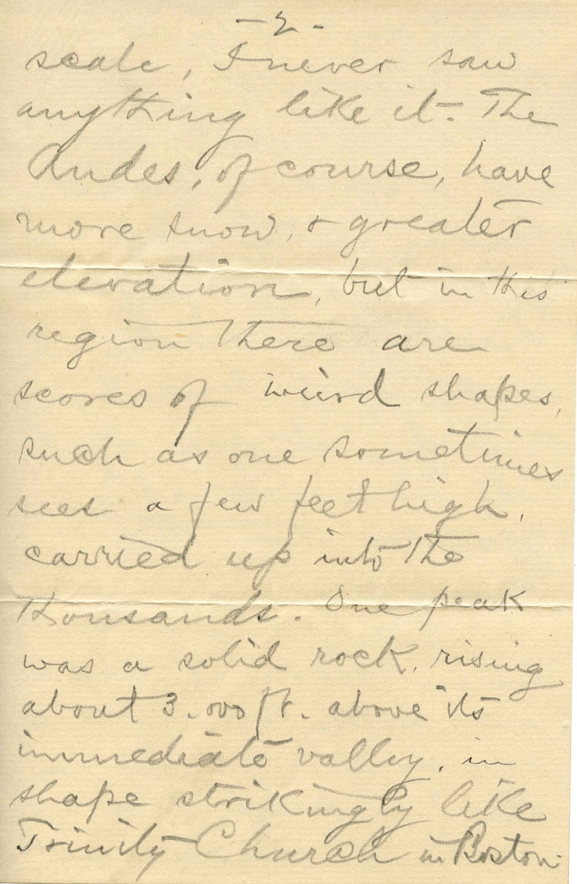 scale, I never saw anything like it. The Andes, of course, have more snow, & greater elevation, but in this region there are scores of weird shapes, such as one sometimes sees a few feet high, carried up into the thousands. One peak was a solid rock, rising about 3,000 ft. above its immediate valley, in shape strikingly like Trinity Church in Boston.