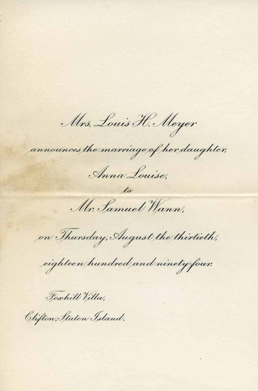 Mrs. Louis H. Meyer announces the marriage of her daughter, Anna Louise, to Mr. Samuel Wann, on Thursday, August the thirtieth, eighteen hundred and ninety-four. Foxhill Villa, Clifton, Staten Island.