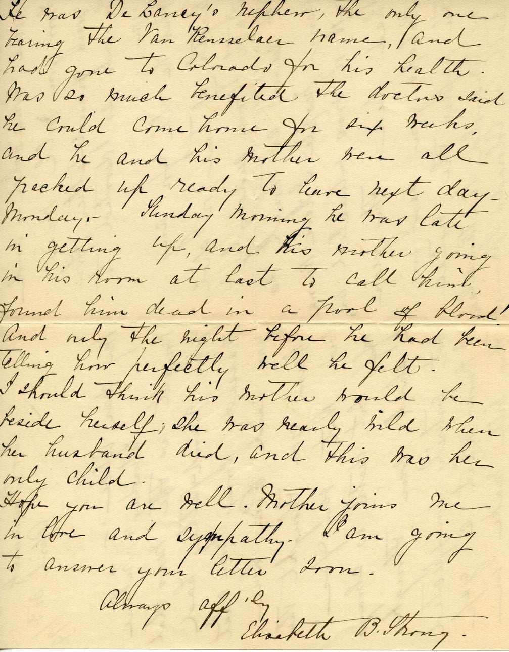 He was De Lancey's nephew, the only one bearing the Van Rensselaer name, and had gone to Colorado for his health. He had so much benefited the doctors said he could come home for six weeks, and he and his mother were all packed up ready to leave next day—Monday. Sunday morning he was late in getting up, and his mother going in his room at last to call him, found him dead in a pool of blood! And only the night before he had been telling how perfectly well he felt. I should think his mother would be beside herself; she was nearly wild when her husband died, and this was her only child. Hope you are well. Mother joins me in love and sympathy. I am going to answer your letter soon. Always aff'ly, Elizabeth B. Strong