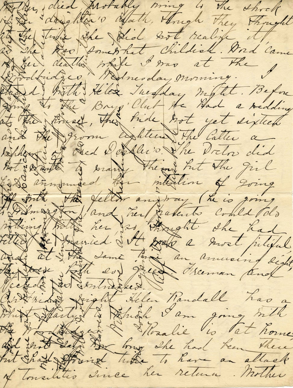Mother died probably owing to the shock of her daughter's death, though they thought at first she did not realize it. She was somewhat childish. Word came of her death while I was at The Foolidge's Wednesday morning. I stayed with Helen Thursday night. Before going to the Boys' Club we had a wedding at the house, the bride not yet sixteen and the groom eighteen. The latter a Red Decker's. The Doctor did not want to marry them but the girl announced her intention of going off with him. The fellow anyway (he is going to immigration) and her parents could do nothing with her so he got married. It was a most pitiful thing an amusing sight, Thomas Freeman and his sister-in-law. At the same time I got a letter from Helen Randall saying I am going with her and that Rosalie is at home. How long she had been there I don't know but she had two to have an attack of tonsillitis since her return. Mother