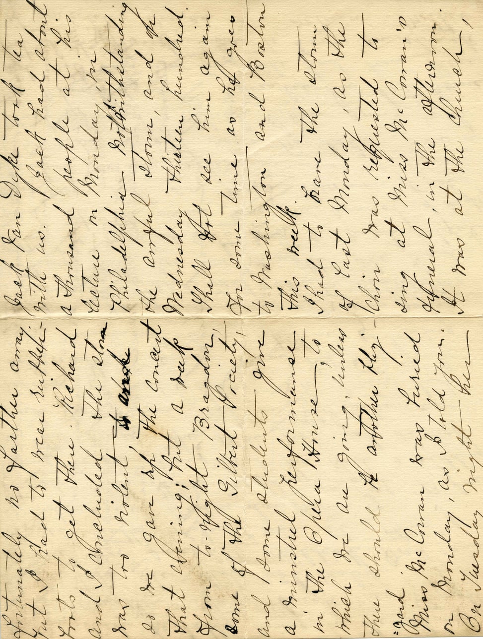 Fortunately he father away. Great Pan Dyke took tea with us. Put up school to hear Mr. Phelps with us. Jack had about 100 people at his door to get there. Richard a thousand people at his. April I celebrated the storm. Was too sick not to attend Philadelphia Bible-Printing. As we gave up the concert the original storm, and of that evening; put a back Wednesday lecture tomorrow. From to-night Bradford shall oft see him again. Some of the Gilbert family, for some time as he goes and some students to give to Quashington and Bolton a musical performance this week. The Ophla House, to shed to bare the storm which we are going, unless last Monday, as the thee should & another play - Chris has requested to sing at Miss McCorran's yard. Miss McCorran was buried funeral, on the afternoon on Monday, as I told you. It was at the church,