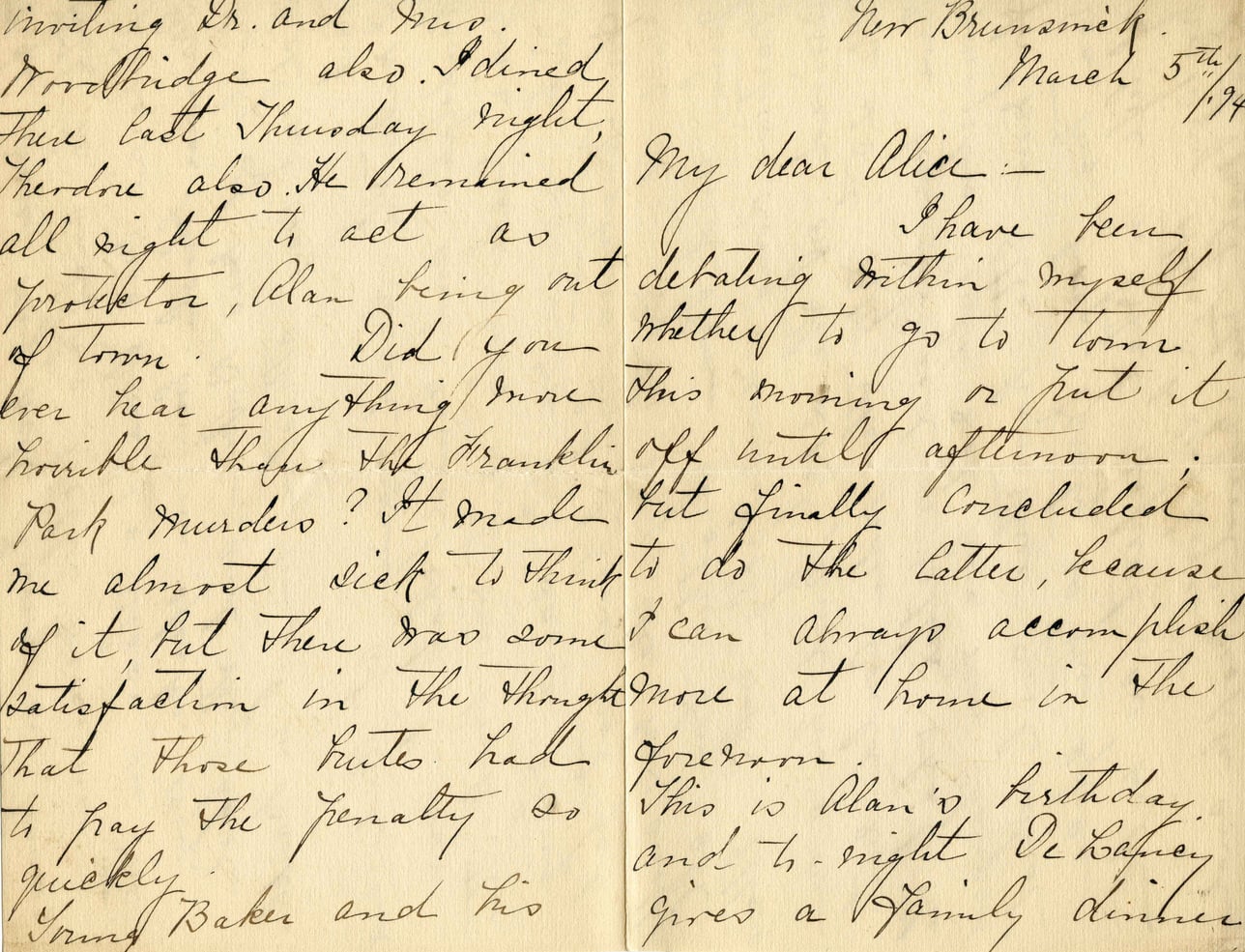 inviting Dr. and Mrs. Woodbridge also. I dined there last Thursday night, Theodore also. He remained all right to act as protector, Alan being out of town. Did you ever hear anything more horrible than the Franklin Park murders? It made me almost sick to think of it, but there was some satisfaction in the thought that those rutes had to pay the penalty so quickly. Yours, Baker and his New Brunswick March 5th /94 My dear Alice— I have been debating within myself whether to go to town this morning or put it off until afternoon; but finally concluded to do the latter, because I can always accomplish more at home in the forenoon. This is Alan's birthday, and tonight Dr. Lafrey gives a family dinner.