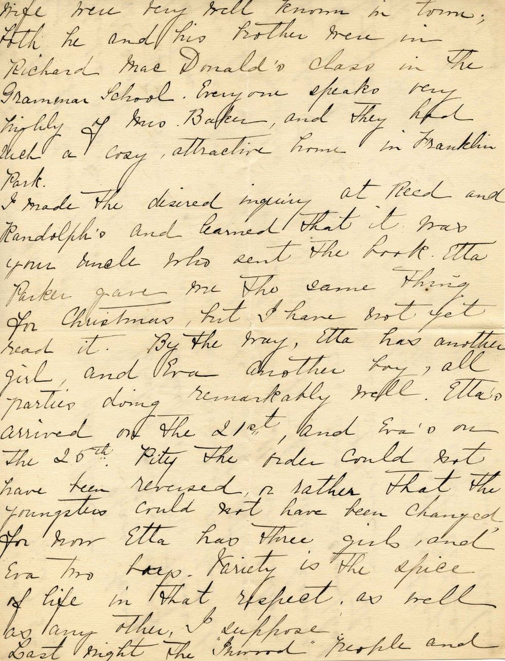 Wife were very well known in town; both he and his brother were in Richard Mac Donald's class in the Grammar School. Everyone speaks very highly of Mrs. Baker, and they had such a cozy, attractive home in Franklin Park. I made the desired inquiry at Reed and Randolph's and learned that it was your uncle who sent the book. Etta Parker gave me the same thing for Christmas, but I have not yet read it. By the way, Etta has another girl, and Eva another boy, all parties doing remarkably well. Etta arrived on the 21st, and Eva on the 26th. Pity the order could not have been reversed, or rather that the youngsters could not have been changed for now. Etta has three girls, and Eva two boys. Variety is the spice of life in that respect, as well as any other, I suppose. Last night the "Shrood" people and