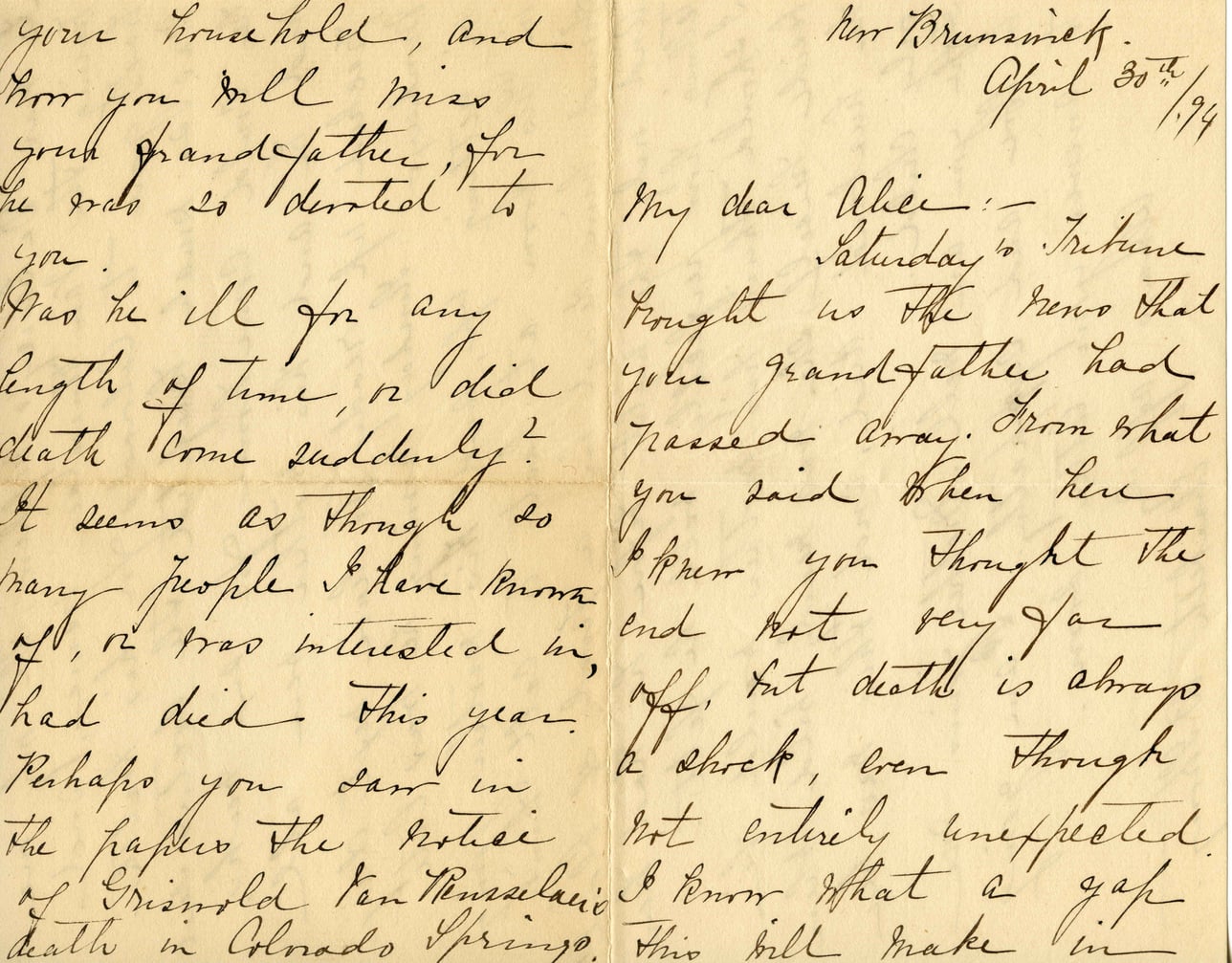 your household, and how you will miss your grandfather, for he was so devoted to you. Has he ill for any length of time, or did death come suddenly? It seems as though so many people I have known of, or was interested in, had died this year. Perhaps you saw in the papers the notice of Griswold Van Penschalio's death in Colorado Springs. Nor Brunswick. April 30th/94 My dear Alice:— Saturday's Tribune brought us the news that your grandfather had passed away. From what you said when here I knew you thought the end not very far off, but death is always a shock, even though not entirely unexpected. I know what a gap this will make in