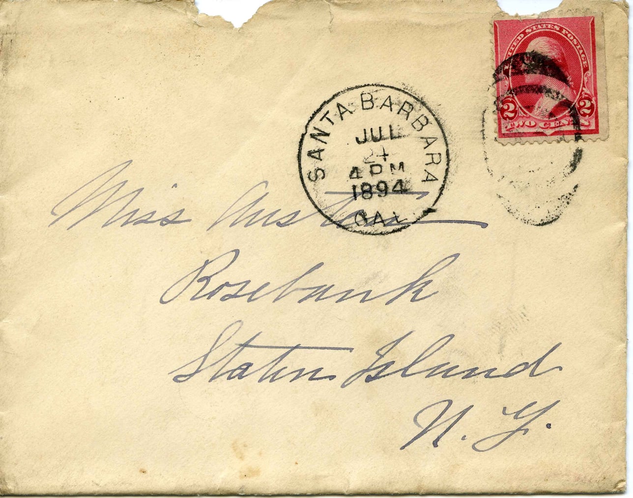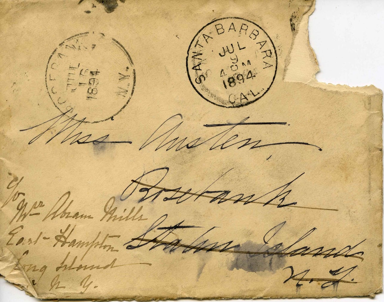 Miss Weston, Postmark Mr. Abraham Mills East Hampton Long Island N.Y. SANTA BARBARA JUL 4 1894 CAL