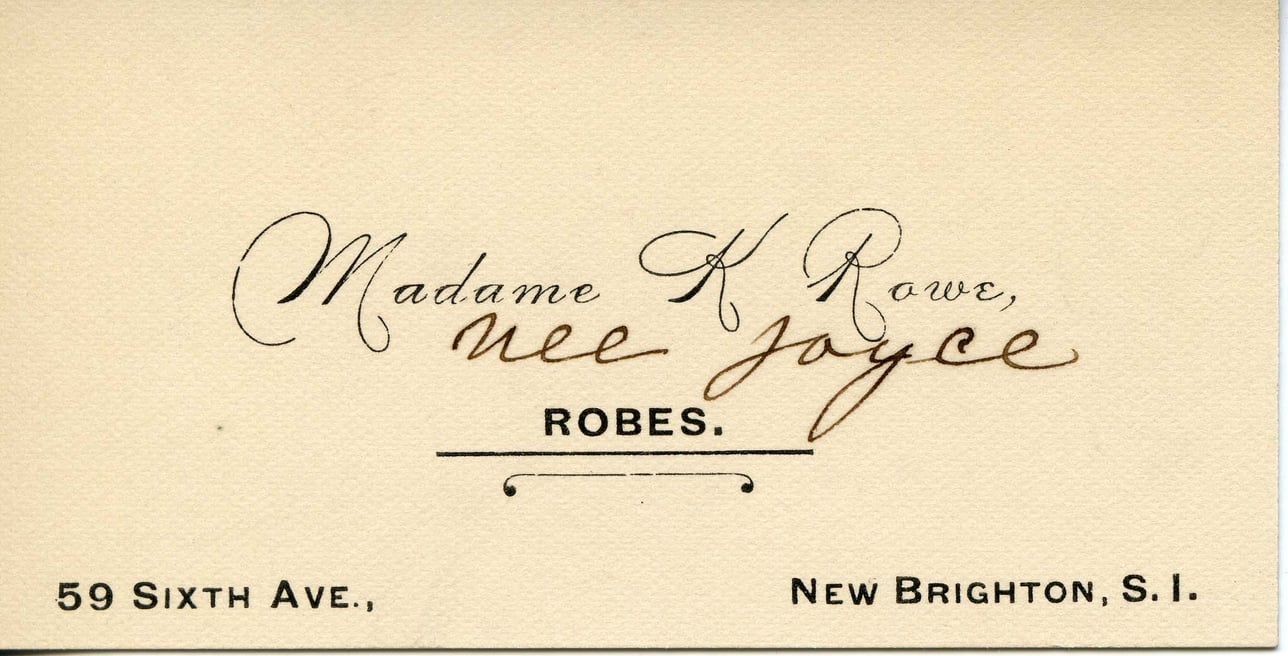 @austen_business_cards_collection -> includes -> @madame_k_rowe_business_cardMadame K. Rowe, nee Joyce ROBES. 59 SIXTH AVE., NEW BRIGHTON, S.I.