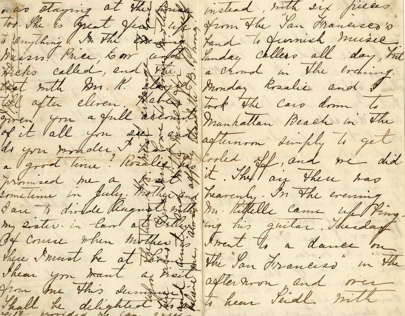 as staying at the house too. She is great fun to anything. In the evening Miss Price, Cor and Hicks called, and I sat with Mr. K. till after eleven. Have given you a full account of it all you see. Do you wonder I had such a good time? Rosalie has promised me a visit sometime in July. Mother and I are to divide August between my sister-in-law at Delray. Of course when Mother is there I must be at Shoreham. I hear you want a visit from me this summer. Shall be delighted to provide for you. instead, with six pieces from The San Francisco's band to furnish music Sunday callers all day, but a crowd in the evening. Monday Rosalie and I took the car down to Manhattan Beach in the afternoon simply to get cooled off, and we did it. The air there was heavenly. In the evening Mr. Tittelle came up singing his guitar. Thursday I went to a dance on the "San Francisco" in the afternoon, and over to hear Peidl with