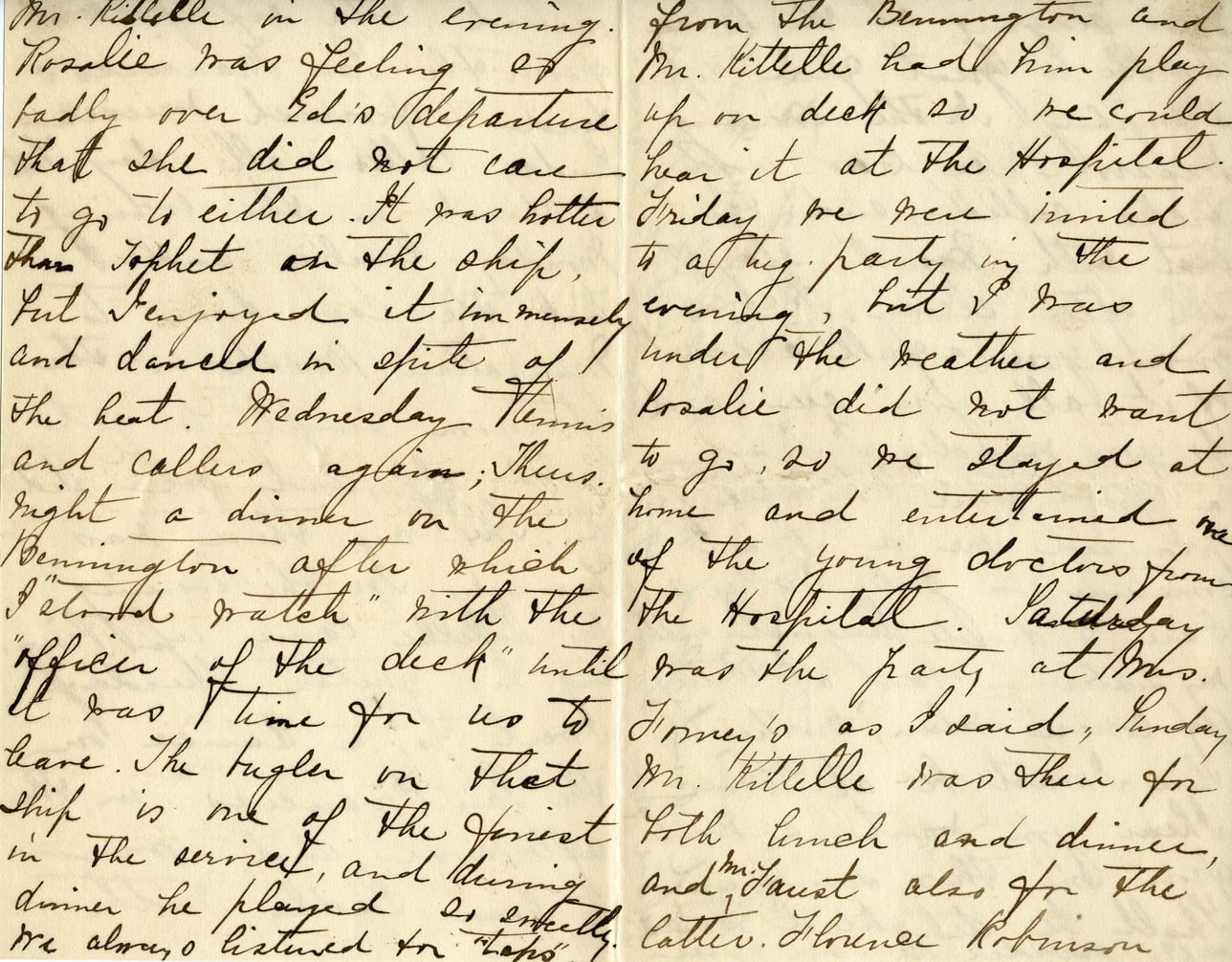 Mrs. Kittelle in the evening. Rosalie was feeling so badly over Ed's departure that she did not care to go to either. It was hotter than Tophet on the ship, but I enjoyed it immensely and danced in spite of the heat. Wednesday Tennis and callers again; Thursday night a dinner on the Bennington after which I "stood watch" with the "Officer of the deck" until it was time for us to leave. The tugler on that ship is one of the finest in the service, and during dinner he played so sweetly we always listened to "tops" from the Bennington and Mr. Kittelle had him play up on deck so we could hear it at the hospital. Friday we were invited to a big party in the evening, but I was under the weather and Rosalie did not want to go, so we stayed at home and entertained one of the young doctors from the hospital. Saturday was the party at Mrs. Torney's as I said, Sunday Mr. Kittelle was there for both lunch and dinner, and Mr. Faust alas for the latter. Florence Robinson