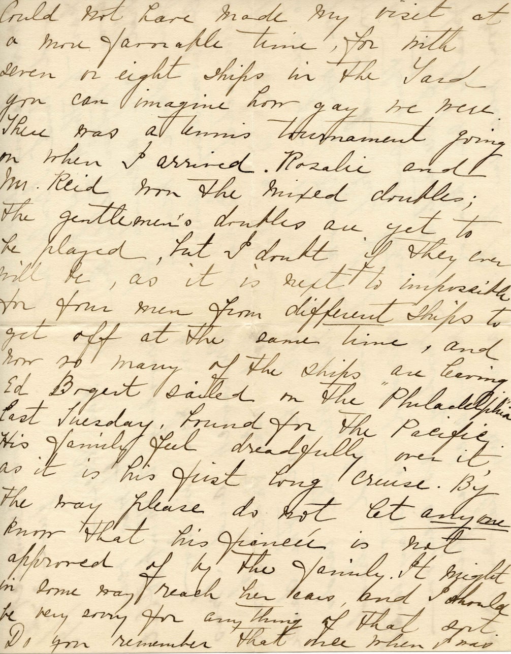 could not have made my visit at a more favorable time, for with seven or eight ships in the yard you can imagine how gay we were. There was a tennis tournament going on when I arrived. Rosalie and Mr. Reid won the mixed doubles; the gentlemen's doubles are yet to be played, but I doubt if they ever will be, as it is next to impossible for four men from different ships to get off at the same time, and now so many of the ships are leaving. Ed Bregent sailed on the "Philadelphia" last Thursday, bound for the Pacific. His family feel dreadfully over it as it is his first long cruise. By the way please do not let only one know that his fiancée is not approved of by the family. It might in some way reach her ears, and I should be very sorry for anything of that sort. Do you remember that once when I was