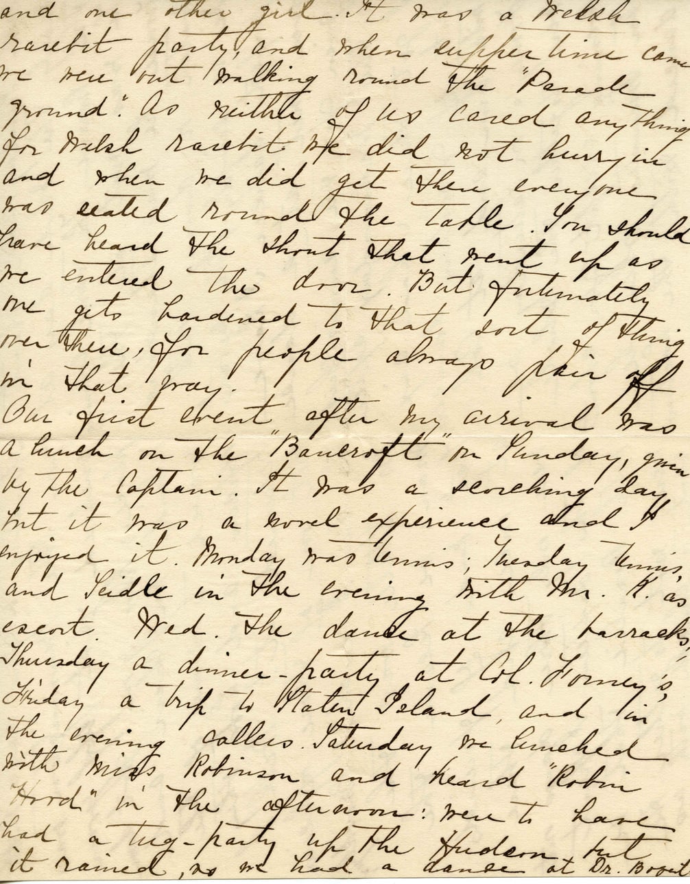 and one other girl. It was a Welsh rackets party, and when supper time came we ran out walking round the "Parade ground." As neither of us cared anything for Welsh rackets he did not hurry in and when we did get there everyone was seated round the table. You should have heard the shout that went up as we entered the door. But fortunately we gets hardened to that sort of thing over there, for people always think of it in that way. Our first event after my arrival was a lunch on the "Bancroft" on Sunday, given by the Captain. It was a scorching day but it was a novel experience and I enjoyed it. Monday was tennis; Tuesday tennis, and Seidle in the evening with Mr. H. as escort. Wed. The dance at the barracks, Thursday a dinner-party at Col. Tommy's, Friday a trip to Staten Island, and in the evening callers. Saturday we lunched with Miss Robinson and heard "Robin Hood" in the afternoon: we to have had a tug-party up the Hudson but it rained, as we had a dance at Dr. Boyd