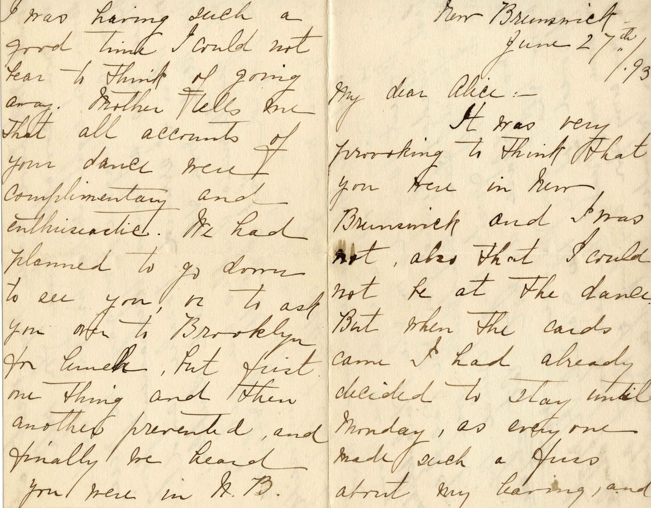 @letter_1893_06_27_strong_to_austen -> includes -> @event_party_manhattan_beach:event {type: "party", location: @manhattan_beach, date: @date_1893_06_27}I was having such a good time I could not bear to think of going away. Mother tells me that all accounts of your dance were complimentary and enthusiastic. We had planned to go down to see you, or to ask you over to Brooklyn for lunch, but just one thing and then another prevented, and finally we heard you were in N.B. New Brunswick June 27th '93 My dear Alice: It was very provoking to think that you were in New Brunswick and I was not, also that I could not be at the dance. But when the cards came I had already decided to stay until Monday, as everyone made such a fuss about my leaving, and