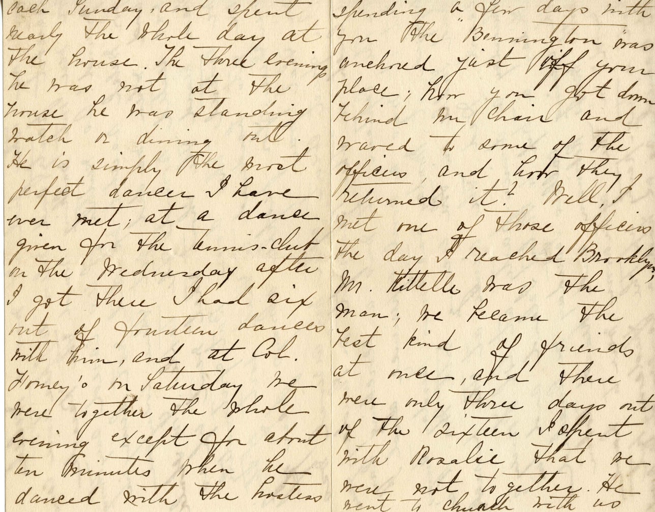 Each Sunday, and spent nearly the whole day at the house. The three evening he was not at the house he was standing watch or dining out. He is simply the most perfect dancer I have ever met; at a dance given for the tennis-club on the Wednesday after I got there I had six out of fourteen dances with him, and at Col. Honey's on Saturday we were together the whole evening except for about ten minutes when he danced with the hostess. Spending a few days with you the "Bennington" was anchored just off your place; how you got down behind my chair and waved to some of the officers, and how they returned it? Well, I met one of those officers the day I reached Brooklyn; Mr. Titelle was the man; we became the best kind of friends at once, and there were only three days out of the sixteen I spent with Rosalie that we were not together. He went to church with us