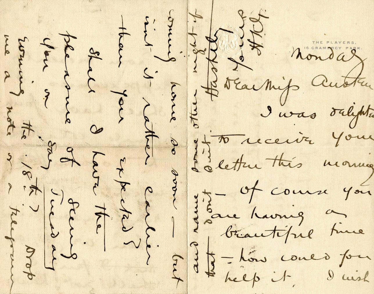 @henry_gilman -> corresponded with -> @bessie_strong {through: @henry_gilman_correspondence}Monday Dear Miss Austen, I was delighted to receive your letter this morning—of course you are having a beautiful time—how could you help it. I wish that point out. Harriet and name some other night—if coming home so soon—but isn't it rather earlier than you expected? Shall I have the pleasure of seeing you on Sat. Tuesday morning? The 18th? Drop me a note or a message.
