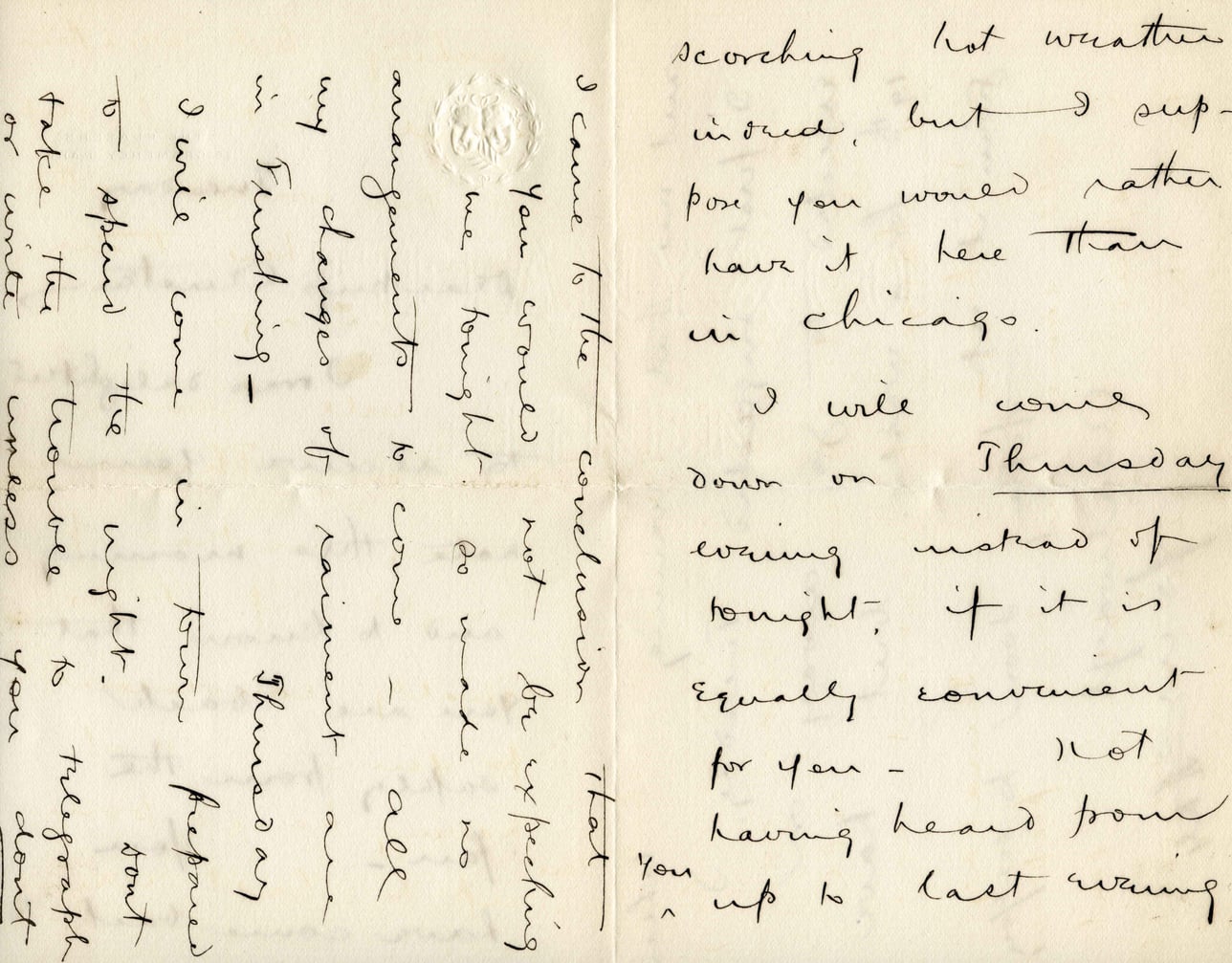 I came to the conclusion that your worries not be expecting me tonight. So made no arrangements to come - all my charges of payment are in Furloughing - Thursday I will come in time prepared to appear) the weather. Don't take the trouble to telegraph or write unless you don't scorching hot weather in Ored, but I suppose you would rather have it here than in Chicago. I will come down on Thursday evening instead of tonight, if it is equally convenient for you - Not having heard from you up to last evening