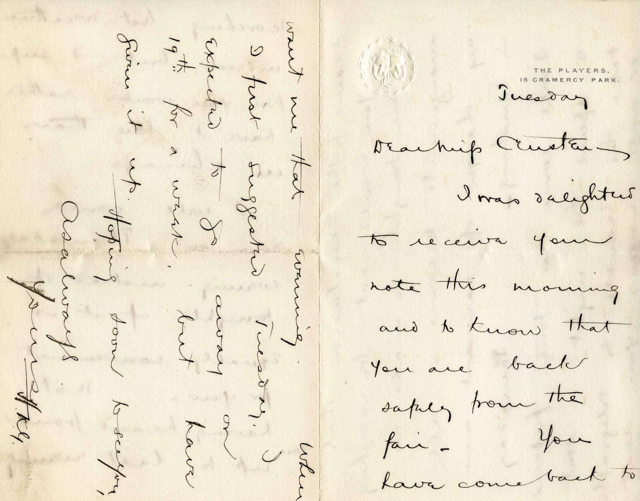 THE PLAYERS, 16 GRAMERCY PARK. Tuesday Dear Miss Custer, I was delighted to receive your note this morning and to know that you are back safely from the fair—You have come back to finish it up. Hoping soon to see you! Always Yours, Your affy, Want me that evening when I first suggested Tuesday. I expected to go away on 19th for a week, but have given it up. As always