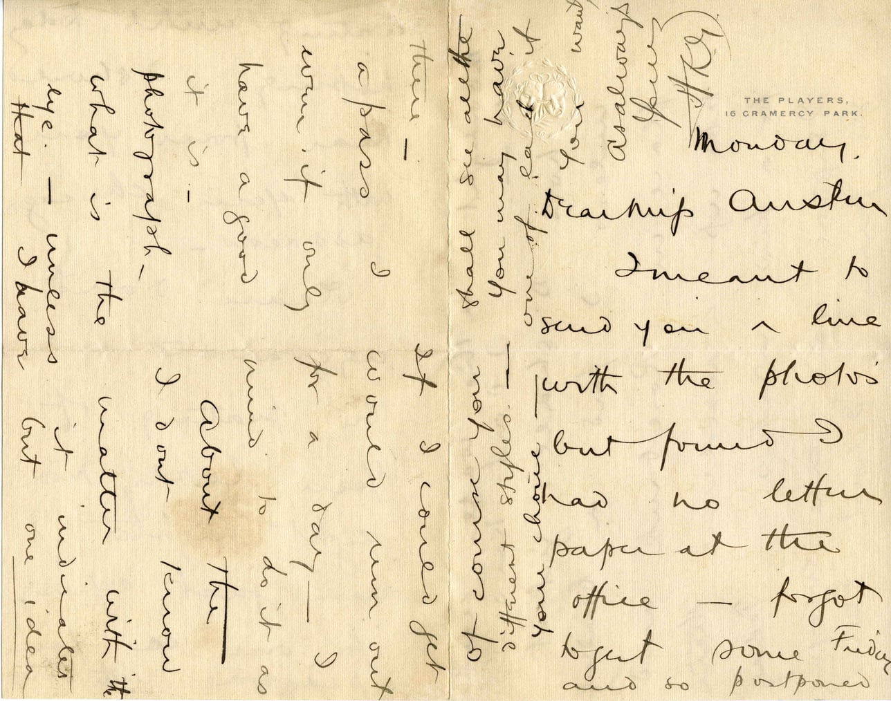 THE PLAYERS, 16 GRAMERCY PARK. Monday, Dear Miss Austin, I meant to send you a line with the photos but found no letters paper at the office—forgot to get some Friday and so postponed Always yours, H.K. Of course you shall see each other if I come for a part I would run out soon—if only for a day—I have a good mind to do it as about that it is—I don't know photograph—unless it was taken what is the matter with it? I have one idea