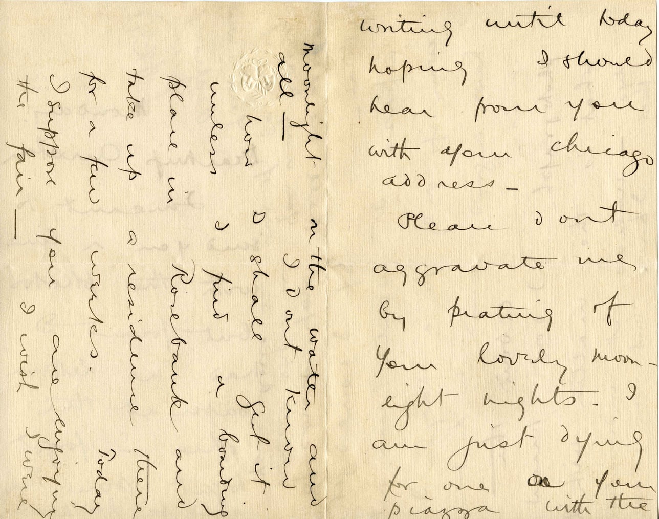 writing until today hoping I should hear from you with your Chicago address - Please don't aggravate me by prating of your lovely moon- light nights. I am just dying for one on your piazza with the moonlight on the water and all I I do not know how I shall get it unless I find a boarding place in Rosebank and take up a residence there for a few weeks. Today? I suppose your are enjoying the rain - I wish
