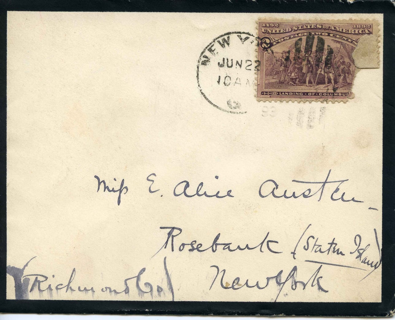 @alice_austen_collection:document {creator: @alice_austen, institution: "Alice Austen House", created: @date_1893, description: "Envelope images showing addresses for Alice Austen's correspondence, including locations in New York, New Jersey, and Illinois."}